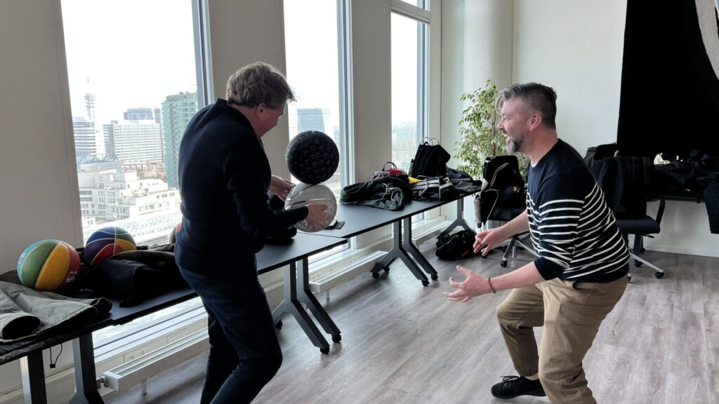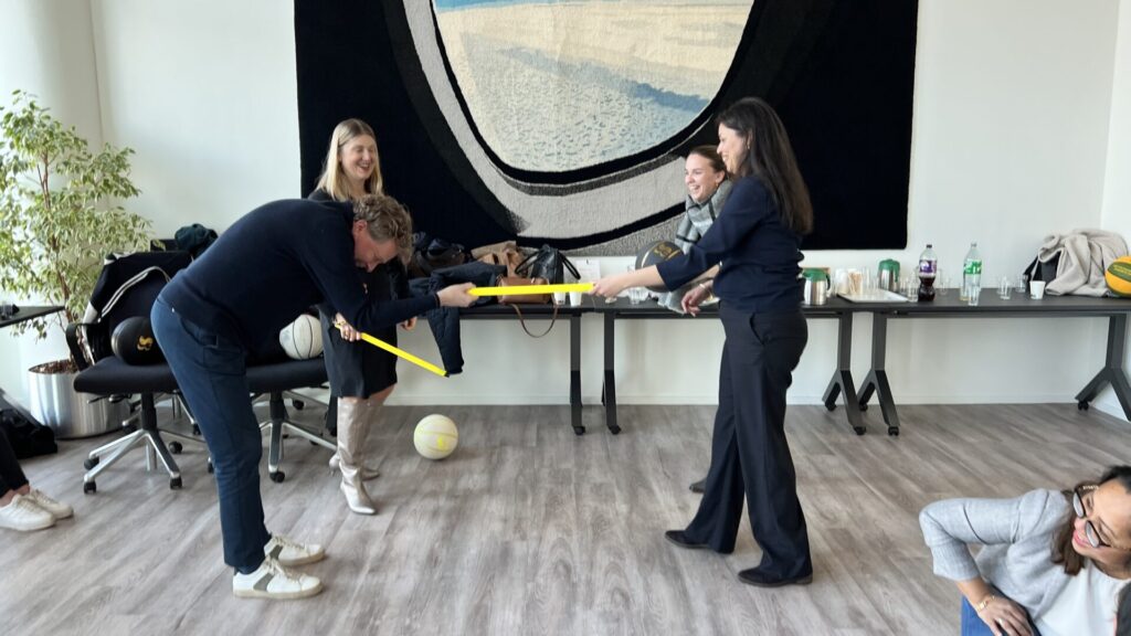 We doen verschillende samenwerkingsoefeningen en tussendoor gaan we met elkaar hierover in gesprek met wat subtiele muziek op de achtergrond. We doen ook meerdere oefeningen waarbij de basketbal de metafoor is voor dagelijkse situaties en uitdagingen op het werk. Er wordt zelfs veelvuldig gelachen en ik zie bij verschillende dames als heren weer het vrije kind naar boven komen.