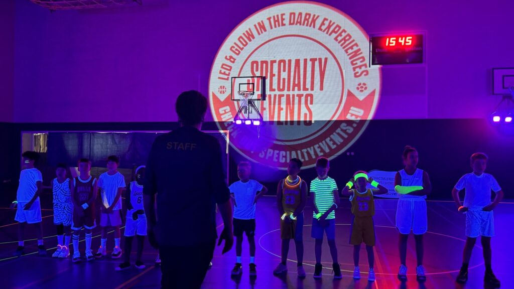 Stel je voor, de magie van de blacklight en de allersnieuwste LED-technologie die de ruimte verlicht. Zelfs de basketballen van Special Balls die wij gebruiken zijn passend bij het thema. Wij maken zelfs gebruik van interactieve en reactieve spellen (blaze pods).