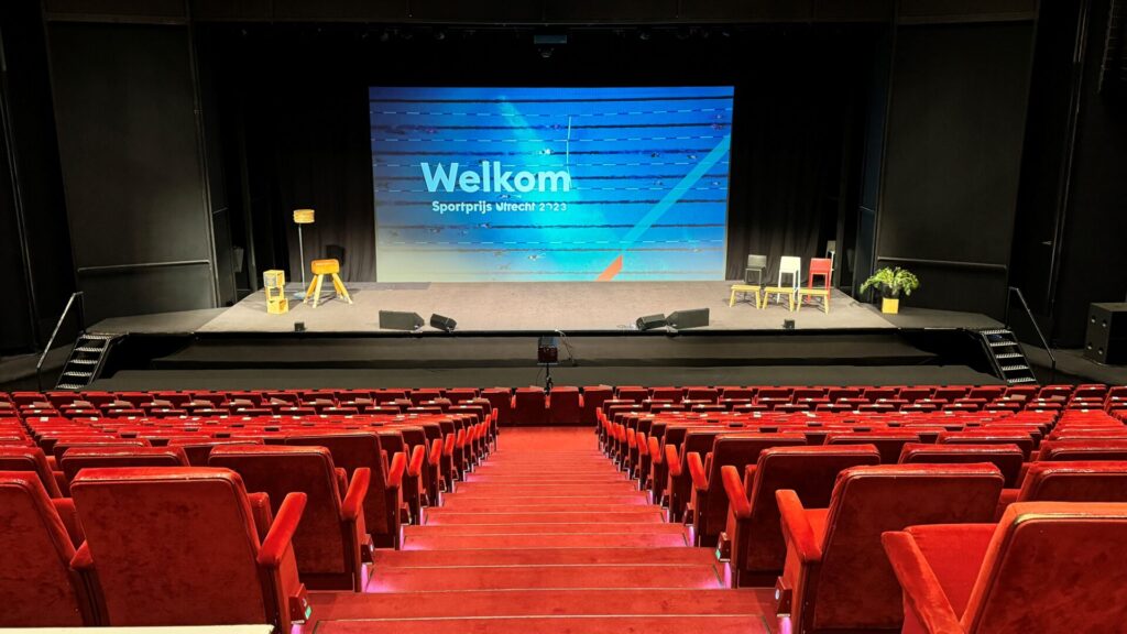 In de lobby staat de DJ al klaar en zijn er ook allerlei spellen klaargezet voor de jongere gehuldigden, zo hebben zij voorafgaand aan het sportgala zelf ook een feestje. Om 16.30 uur start de generale repetitie in het mooie theater waar straks 1000 man publiek zal zitten. Indrukwekkend om vanuit de stilte van dat grote theater de stage te checken. Zoals bij elke show zijn er uitdagingen. In dit geval is dat een tapijt, waar basketballen niet op stuiteren en het podium is niet bepaald diep. Met de backlight lampen kunnen we bepaalde accenten verlichten.